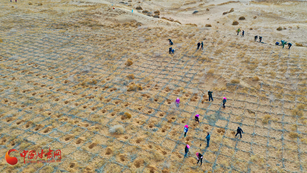 3月12日,市民在阻沙網(wǎng)內(nèi)種植梭梭。(無人機拍攝)
