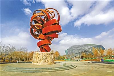 公園里《中華第一爆》的主碑,由雕塑家何鄂創(chuàng)作,它顏色呈鐵銹紅,金屬構件回環(huán)纏繞,形象地模擬了“蘑菇云”的形狀。