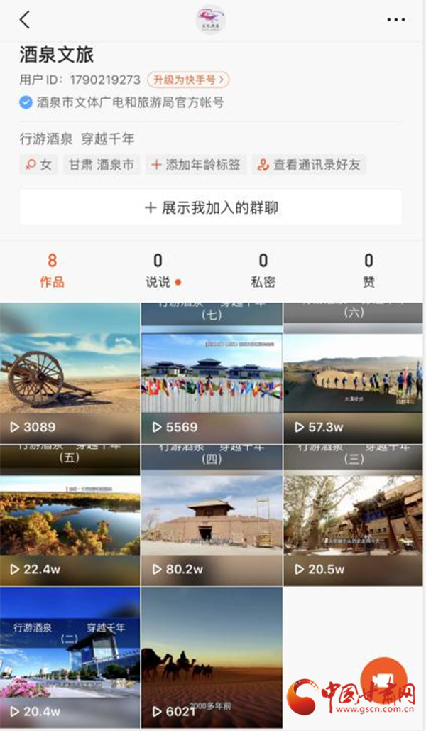 “酒泉文旅”快手官方賬號(hào)截圖