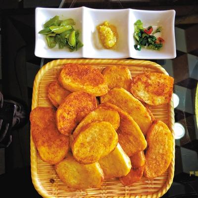炕鍋洋芋是臨夏農(nóng)家樂(lè)里面常見(jiàn)的一道特色小吃,在臨夏,煎、烙之類的烹飪方式都被稱作炕,炕鍋洋芋因此得名。洋芋切片后,直接放熱油中兩面煎透。炕鍋洋芋的做法雖不復(fù)雜,但其對(duì)于火候的要求卻極其嚴(yán)苛,多一分會(huì)焦,少一分則不熟。