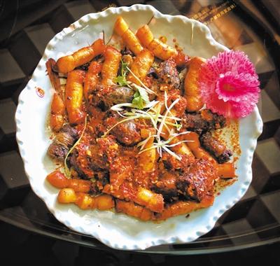 這道美食曾上過(guò)《舌尖上的中國(guó)》,它的神秘感來(lái)自于食材:發(fā)子色澤暗紅,面腸通體白凈,配以鮮紅的辣椒油,色澤亮麗,風(fēng)味獨(dú)特。發(fā)子是將新鮮羊心、羊肺、羊肉剁碎,拌以蔥、油、調(diào)味品,撒以適量面粉,制成餡子,裝入羊腸中,入火蒸好后,切段入盤(pán)。面腸以面粉為主料,配以調(diào)味品,灌入羊小腸中,放入蒸籠約蒸15分鐘,中間須針刺泄氣,以防破裂,熟后切段入盤(pán)。按臨夏習(xí)慣,發(fā)子面腸組合成一道菜,盤(pán)底放面腸,上面放發(fā)子,再放入辣椒油、蒜泥、香醋等即可享用。