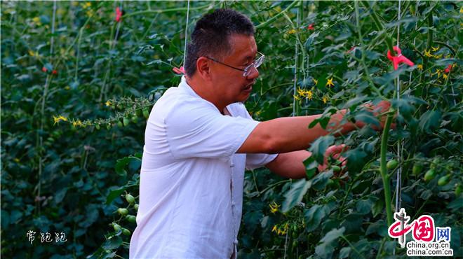 ?。▓D:番茄小鎮(zhèn)負(fù)責(zé)人毛建偉在摘番茄