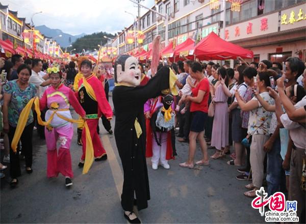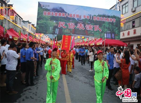 小鎮(zhèn)很熱鬧。小鎮(zhèn)現(xiàn)已入駐了十幾家大型連鎖超市,500多家賓館飯店,300多家購物店。每到雙休日,操著各色口音的四海賓客在街上蹓跶、徜徉,或在超市購物店里選購精美的土特產(chǎn),或在酒店里品嘗著山珍野味,或在KTV里痛快豪嗓,或圍著篝火歡歌勁舞,有的干脆就光著膀子在露天的小吊鍋前劃拳行令,恣意灑脫,好不愜意。每年農(nóng)歷六月初六,天堂寨都要舉辦隆重的天貺節(jié),天堂寨鎮(zhèn)政府門前的一公里主街道兩邊擺起了長龍似的紅色帳篷,“百家吊鍋宴”成為中外游客免費品嘗天堂寨美食的饕餮盛宴。人們一邊喝著小吊美酒,吃著山珍美味,一邊欣賞著穿街而過的威風鑼鼓、騰龍舞獅、儺戲花船、獨輪推美女、花棍打癡郎等不斷推陳出新的民俗風情表演。酒足飯飽之后,再到政府廣場觀看精彩紛呈的文藝節(jié)目。一時間,人山人海,把一個千米“長街”擠得水泄不通;歡聲笑語,把一個深山小鎮(zhèn)匯成了歡樂的海洋……
