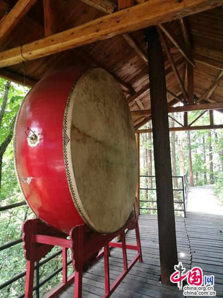 不知是何等神力相助,我竟然氣不急喘,腿不灌鉛,一口氣沖到了大鐘處。在一處長約兩百米,寬約五六米的突兀石崖下,竟然有一條長百米寬約三米的平坦棧道,直抵懸崖石壁,仿佛一條地道的天街。從懸崖上吊掛下來一尊重達千斤的銅鐘,鐘邊吊一根木質(zhì)鐘錘,錘身已裂開,兩頭均被撞成起毛的“絨團”,由此可知,到達此處撞鐘的勇士并非少數(shù)。我乘興上去重重地撞了九下,雄渾、恢弘的鐘聲,在峽谷上空久久地回蕩。