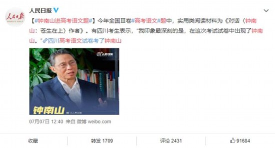 不過(guò),他沒(méi)想到,今年全國(guó)Ⅲ卷高考語(yǔ)文題中,實(shí)用類閱讀材料為《對(duì)話〈鐘南山:蒼生在上〉作者》。有四川考生表示,“我印象最深刻的是,在這次考試試卷中出現(xiàn)了鐘南山。”