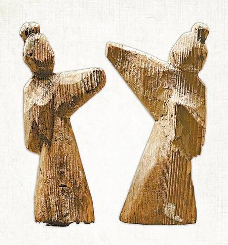 武威磨嘴子漢墓出土,現(xiàn)藏甘肅省博物館的兩件彩繪木舞蹈俑,其中一件寬4.9厘米,厚3.5厘米,高26.7厘米。木俑梳高髻,著長袍,身體向右傾斜,左臂置于胸前,右臂舉起,頭微側(cè),作舞蹈狀。另一件木俑底寬5.4厘米,高14.5厘米,削制而成。以黑、紅兩色繪五官和衣領(lǐng)等。木俑挽高髻,穿袍服。左臂撫胸,右臂向前上舉起,身子傾斜,作舞蹈狀。它們和同一地點出土的漆樽舞蹈畫一樣,都是現(xiàn)實生活中官僚貴族富戶舞伎的藝術(shù)再現(xiàn)。