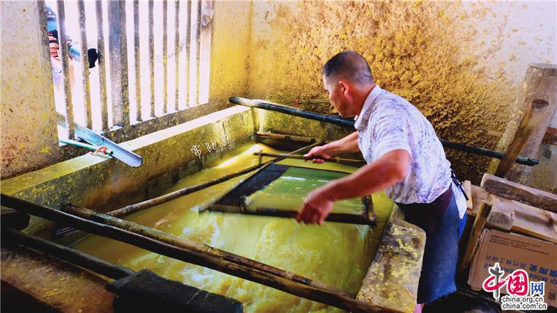 隆回縣灘頭鎮(zhèn)桃林村手工抄紙作坊,已經(jīng)成為一處著名的文旅項(xiàng)目景點(diǎn)。走進(jìn)陶林村,一棟棟青瓦石墻的新屋吸引了人們的目光。屋外山坡竹林茂密,山溪流水潺潺,屋內(nèi)手工抄紙制作的原料、工具布置的次序井然,手工抄紙的全套工藝流程在這幾棟屋中得以完整體現(xiàn)。手工抄紙技術(shù)歷史悠久,始于隋唐,至明朝時(shí)抄紙已經(jīng)非常盛行。上世紀(jì)八十年代鼎盛時(shí)還曾遠(yuǎn)銷東南亞和日本。非遺傳承人李志軍今年61歲,自稱“紙蟲(chóng)”,帶領(lǐng)著全家人承襲著祖宗留下的獨(dú)特技藝。而支撐著李志軍的堅(jiān)守的,是隆回縣文旅部門(mén)的巨大付出和努力。2011年,他們支持李志軍建立了手工抄紙標(biāo)準(zhǔn)化作坊,2016年又對(duì)該作坊進(jìn)行擴(kuò)建,使之成為國(guó)家級(jí)非遺項(xiàng)目。灘頭手工抄紙作坊占地面積1714平方米,是灘頭手工抄紙有史以來(lái)最大的作坊,同時(shí)也是集生產(chǎn)、創(chuàng)新、傳承、展示、研學(xué)為一體的重要基地和文旅基地。