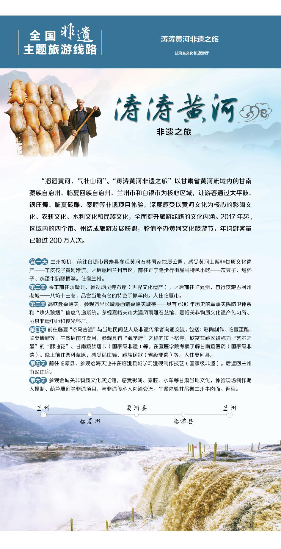 中國社科院財經(jīng)學(xué)院旅游研究室主任戴學(xué)峰對我省入選的兩條線路這樣點評:“交響絲路非遺之旅”涉及敦煌(酒泉)、嘉峪關(guān)、金昌、張掖、武威、蘭州等絲綢之路上最為重要的節(jié)點,其文化含量不容置疑,而且非遺傳承人云集、傳承活動豐富多彩,生產(chǎn)性傳承和活態(tài)傳承歷歷如新。這條線路開發(fā)運營多年,中外市場認(rèn)可度較高,市場前景優(yōu)良,是一條非常成熟的非遺旅游線路;黃河是中華民族的母親河,是華夏文明的搖籃。黃河流域非物質(zhì)文化遺產(chǎn)的保護(hù)傳承和創(chuàng)新弘揚是黃河文化的重要支撐。“濤濤黃河非遺之旅”位于“黃河源頭”的核心片區(qū),該線路全程通過“經(jīng)典旅游線路+非遺項目”的融合體驗,可讓游客在旅游的同時,感受甘肅黃河流域燦爛的非遺文化,全面提升旅游線路的文化內(nèi)涵。