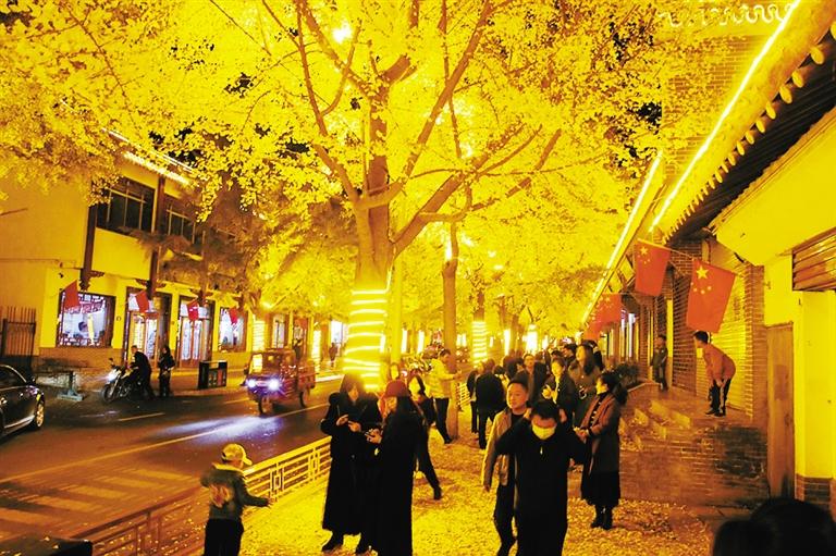 立冬前后,被稱為“黃金大道”的天水市青年南北路銀杏一條街,黃葉飛舞一地金黃,迎來一年中最佳觀賞期。 天水市秦州區(qū)青年南北路全長700余米,道路兩側(cè)種滿了銀杏樹。落葉季節(jié),每到夜幕降臨后,銀杏樹上的LED金黃色燈帶亮燈后,整條街黃葉黃燈交相輝映,璀璨奪目,成了市民近日遛彎首選的“打卡”地。