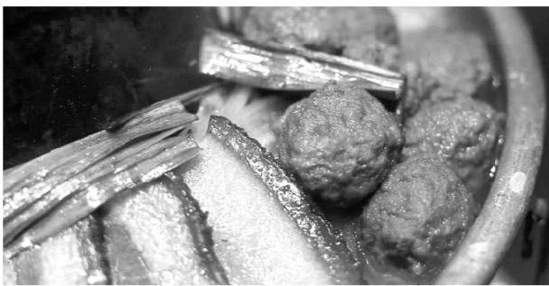 等熬得滋滋有聲香氣四溢時(shí),撒上蔥絲、紅辣椒絲和香菜就可開(kāi)吃。