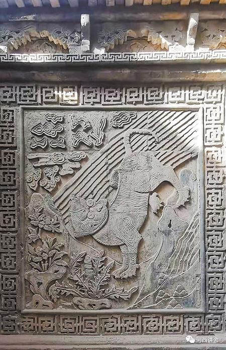 出了東別院,穿過正殿抱廈,在與之相對的西別院門口,門側(cè)墻面磚雕為:“福在眼前”,鐫刻著一只活潑可愛的小老虎,“虎”諧音“福”,也意右白虎。