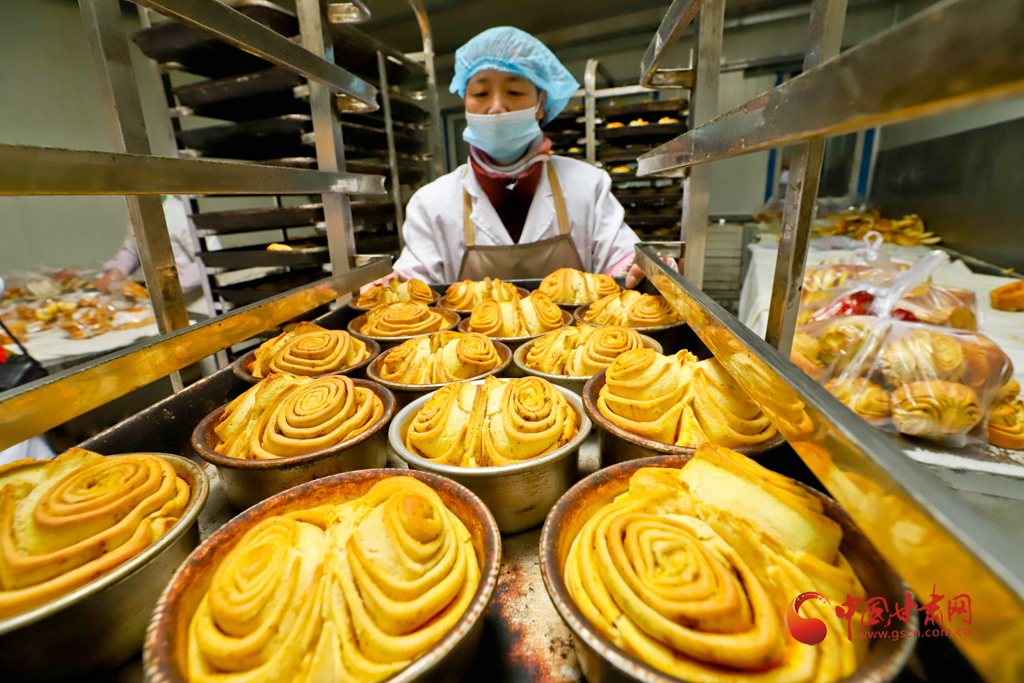 1月6日,甘肅民樂(lè)縣隴上鄉(xiāng)村農(nóng)業(yè)科技公司鄉(xiāng)村饃饃加工車(chē)間里員工從烤爐中取出烤制好的“燒殼子”。