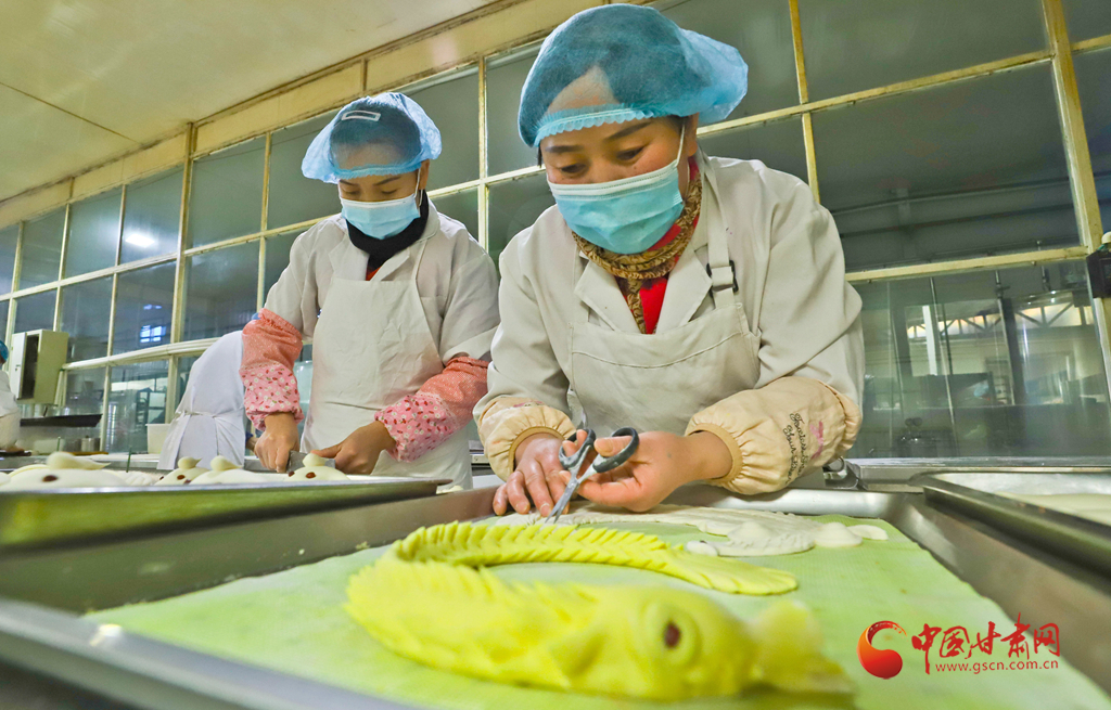 1月6日,甘肅民樂(lè)縣隴上鄉(xiāng)村農(nóng)業(yè)科技公司鄉(xiāng)村饃饃加工車(chē)間里員工正在精心制作“祥龍花饃饃”。