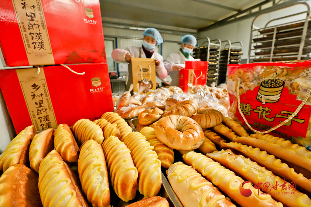 1月6日,甘肅民樂(lè)縣隴上鄉(xiāng)村農(nóng)業(yè)科技公司鄉(xiāng)村饃饃加工車(chē)間里員工正在精心包裝“花饃饃”。