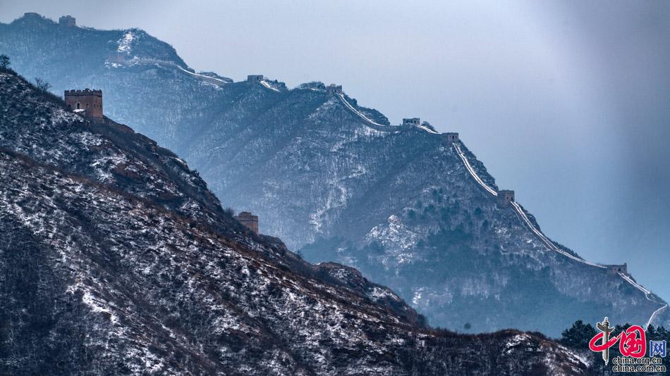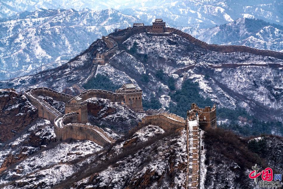 在春雪覆蓋下,山巒起伏,壯觀的長(zhǎng)城在崇山峻嶺之巔如巨龍飛舞,一幅雪墨丹青,令人向往。