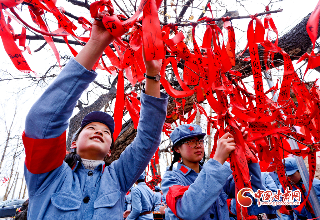3月31日,甘肅張掖甘州區(qū)龍渠鄉(xiāng)中心學(xué)校的師生在紅軍樹(shù)上系上心愿紅飄帶,祝愿祖國(guó)繁榮昌盛。