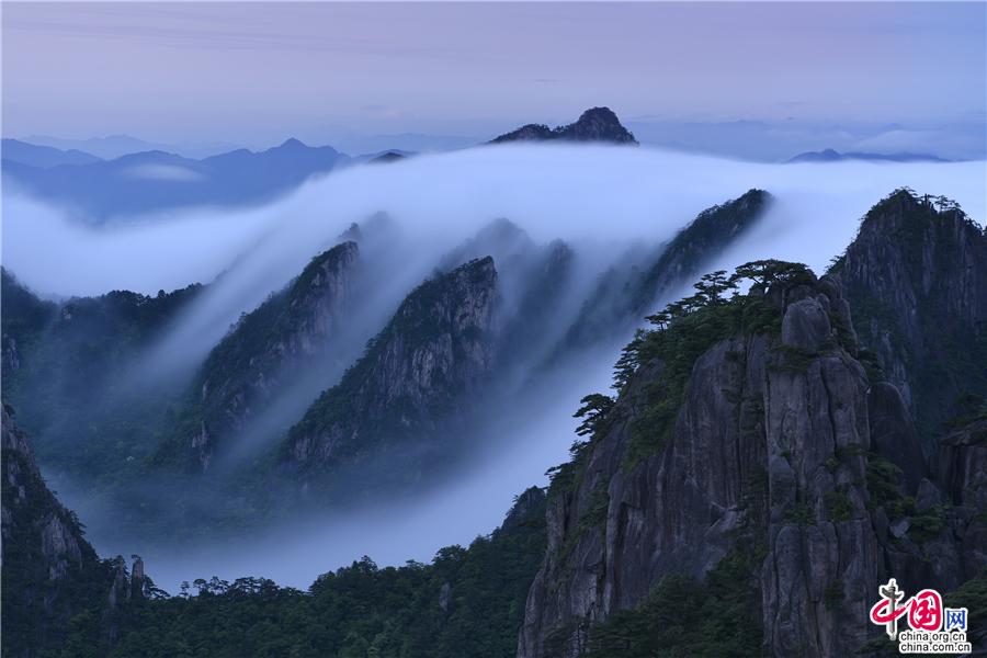 5月22日傍晚,雨后安徽黃山風景區(qū)現(xiàn)壯觀的云海奇觀,見云海奔騰而來,越過北海的始信峰,沿著群峰傾瀉而下勢如瀑布之壯觀,在奇群、怪石和形態(tài)各異黃山松的作用下勾勒出一幅幅流動的水墨畫;黃山不僅是云霧之鄉(xiāng),更是中國傳統(tǒng)水墨畫的天然的素材。(姚育青)