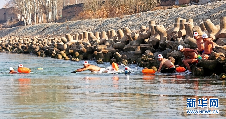 2022年元旦假期,甘肅省白銀市21名冬泳健將冒著嚴寒來到黃河白銀水川段,以漂流或橫渡的方式暢游黃河,歡慶新年。新華網(wǎng)發(fā)(熊江彬 攝)