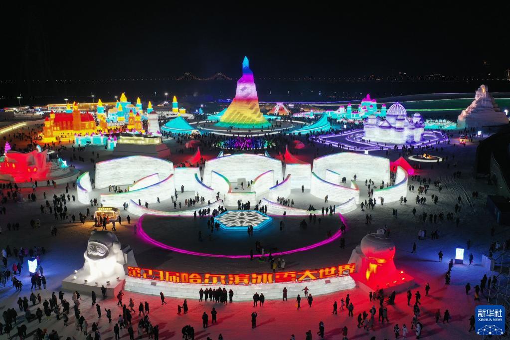 2021年12月25日,游客在哈爾濱冰雪大世界園區(qū)游玩(無人機(jī)照片)。