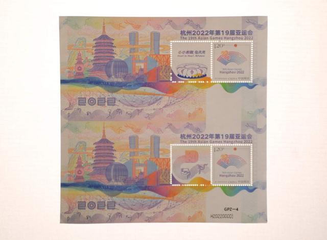 據(jù)了解,《杭州2022年第19屆亞運會》特殊版式個性化郵票雙連張是中國集郵有限公司匠心打造的首款GPZ編號體育題材郵票,由青年設(shè)計師趙郁竹擔(dān)綱設(shè)計,限量發(fā)行。它依托杭州亞運會色彩系統(tǒng)和視覺形象元素,融歷史文化、現(xiàn)代美學(xué)和未來暢想于一體,集藝術(shù)感、科技感和運動感于一身,展現(xiàn)中華文明、浙江風(fēng)采、杭州韻味和時代魅力,采用特殊版式、編號和工藝,紫光燈下局部呈現(xiàn)無色熒光油墨圖案和全真彩效果,傳遞中國郵政對杭州亞運的美好祝福。(圖片由人民日報客戶端提供)