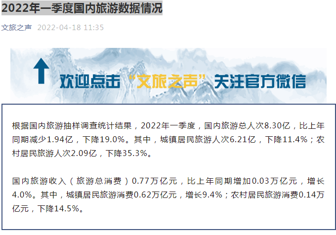 文化和旅游部表示,根據(jù)國內(nèi)旅游抽樣調(diào)查統(tǒng)計結(jié)果,第一季度國內(nèi)旅游收入(旅游總消費)0.77萬億元,比上年同期增加0.03萬億元,增長4.0%。其中,城鎮(zhèn)居民旅游消費0.62萬億元,增長9.4%;農(nóng)村居民旅游消費0.14萬億元,下降14.5%。