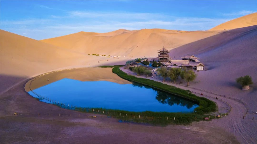 今年4月,敦煌市氣候溫潤(rùn),雨水較多,鳴沙山月牙泉景區(qū)草木蔥蘢,月牙泉水位持續(xù)上升。從4月23日在月牙泉航拍的圖片可以看出,月牙泉水域面積逐漸擴(kuò)大,泉水已滲出月牙泉圍欄之外近1米的距離。據(jù)悉,3年前月牙泉泉水一直保持在圍欄之內(nèi)。