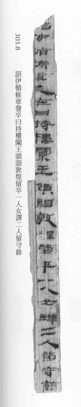 這是樓蘭王及部眾二百六十余人由西向東去長安時(shí),敦煌郡為做好接待工作而做準(zhǔn)備的發(fā)文,要求準(zhǔn)備必要的車馬集中到敦煌以備樓蘭王一行使團(tuán)使用。簡文標(biāo)點(diǎn)作“樓蘭王以下二百六十人當(dāng)東傳車馬,皆當(dāng)柱敦。”本簡沒有具體的紀(jì)年時(shí)間,從簡牘記載的“樓蘭王”字樣可知,此簡的時(shí)代在昭帝早期即元鳳四年之前(前77年),自公元前77年傅介子伐樓蘭之后,樓蘭國改名為鄯善國。