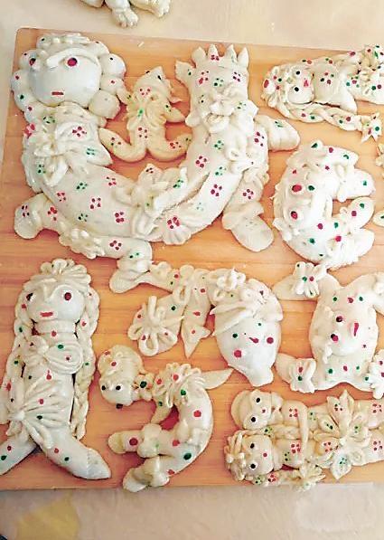 靜寧人的花饃饃,正是應(yīng)和了消病消災(zāi)、祈求平安的民間心理。端午禮儀中的面塑,表達(dá)著人們對(duì)美好事物的向往和祈禱。雖然是以食物的面目出現(xiàn),但那些充滿靈性的造型,卻飽含著人文的意蘊(yùn)。靜寧人塑成動(dòng)物的面花中,最多的是蟾蜍和蛇。蛇面花多是盤成一團(tuán)的,沒有攻擊性又溫和的樣子。蟾蜍面花本地人叫“癩呱子”,形象很可愛,多的是兩只后足弧形對(duì)稱,蜷在腹部?jī)蓚?cè);兩只前足在頭頂相合,呈環(huán)抱姿態(tài)。也有別出心裁的婦女,會(huì)做出十二生肖之類的面花,這些面花,修飾并不夸張,其神韻更勝于外在的精致技巧。所有的端午面花都寄寓著大人們的祈福,但孩子們最喜歡的是動(dòng)物面花,古靈精怪的,讓他們舍不得摸,更舍不得吃,只能與荷包一起掛在胸前賞玩,或與鄰家的小孩子一起比,看誰的媽媽手更靈更巧。