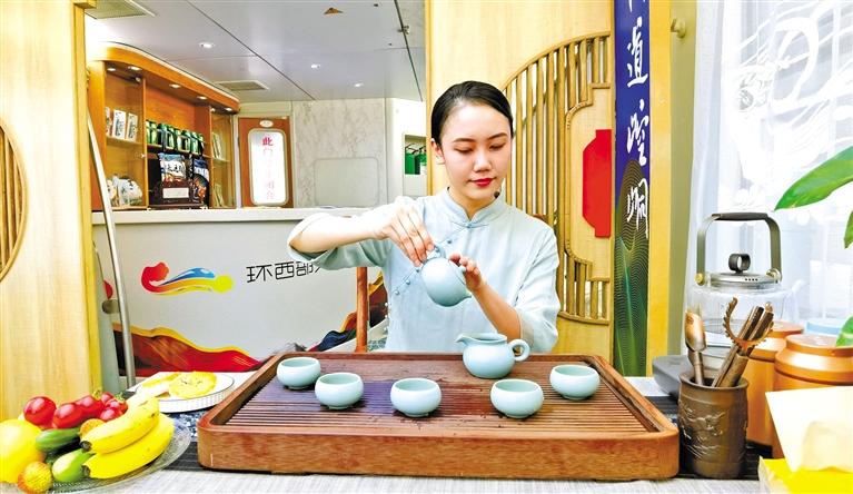 這趟列車由6節(jié)軟臥車廂、1節(jié)餐車、1節(jié)休閑娛樂功能車組成,車體內(nèi)外隨處可見平?jīng)鑫幕糜卧?。記者在車廂?nèi)看到,崇信龍泉寺、華亭安口窯古村落、靜寧仙人峽……每一間軟臥門上都是絕美的平?jīng)鲲L光大片,整個車體儼然移動的“平?jīng)鑫穆谜桂^”,讓人“身未動,心已遠”。車體中部的功能車,更是顛覆了以往人們對火車的認知,麻將桌、功夫茶、全套的K歌設(shè)備,還有平?jīng)鎏厣穆蒙唐?、農(nóng)特產(chǎn)品展銷區(qū),平?jīng)鑫穆脮営[區(qū)、平?jīng)鑫幕黝}報刊欄,足以打發(fā)游客在旅途中的無聊時光。餐車也極富特色,車廂頂部裝飾有色彩豐富的藻井圖案,飛天仙子衣袂飄飄、環(huán)繞四周。“在這樣的餐車上吃飯,吃的那是品位。”一位乘客開心地和同行的伙伴說著。62歲的張女士一到平?jīng)鼍兔Σ坏亟o女兒發(fā)微信,“火車上住得舒適,服務(wù)好,環(huán)西部火車游·崆峒號很超值!”