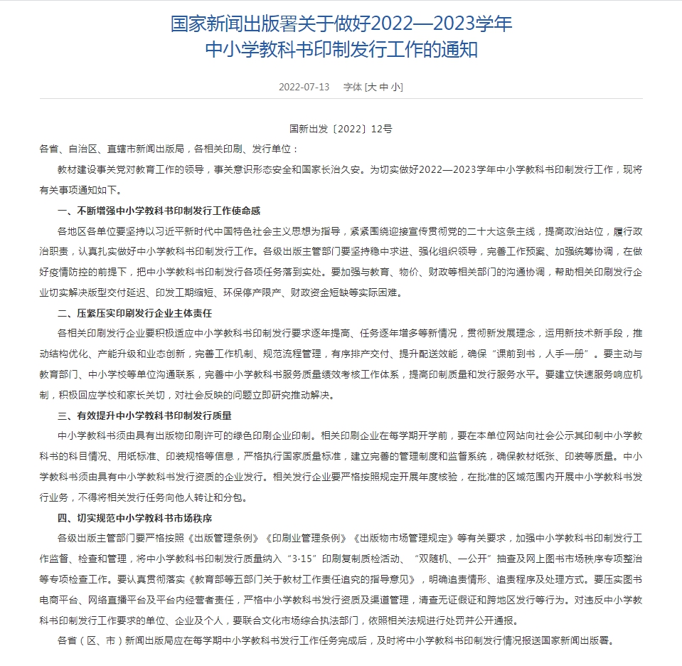 13日,國家新聞出版署網(wǎng)站發(fā)布《國家新聞出版署關于做好2022—2023學年中小學教科書印制發(fā)行工作的通知》(以下簡稱《通知》)。其中強調(diào),各相關印刷發(fā)行企業(yè)要積極適應中小學教科書印制發(fā)行要求逐年提高、任務逐年增多等新情況?!锻ㄖ返淖詈蟊硎?,要切實規(guī)范中小學教科書市場秩序。
