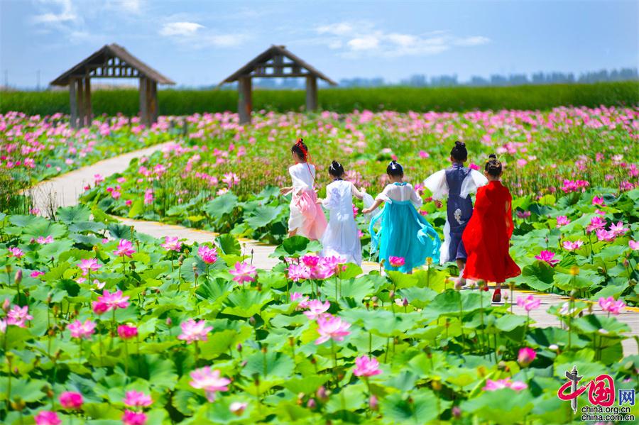 原標(biāo)題:寧夏沙湖: 接天蓮葉無窮碧 國(guó)風(fēng)漢服映荷塘(圖)