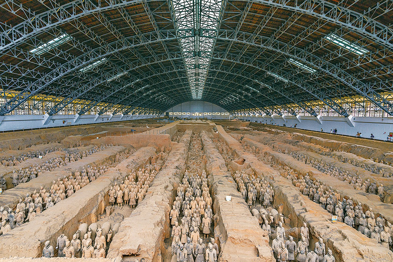 秦始皇陵是中國歷史上第一個多民族的中央集權(quán)國家的皇帝秦始皇于公元前246年至公元前208年營建的。作為秦始皇陵陪葬墓坑之一的兵馬俑坑于1974年被發(fā)現(xiàn),被譽(yù)為“世界第八大奇跡”。圖為秦始皇兵馬俑博物館一號坑全景。 人民圖片 丁俊豪/攝