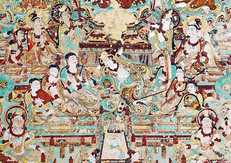 敦煌文化延續(xù)近兩千年,是世界現(xiàn)存規(guī)模最大、延續(xù)時間最長、內(nèi)容最豐富、保存最完整的藝術(shù)寶庫,是世界文明長河中的一顆璀璨明珠,也是研究我國古代各民族政治、經(jīng)濟(jì)、軍事、文化、藝術(shù)的珍貴史料。圖為莫高窟第112窟南壁壁畫“反彈琵琶樂舞圖”?!《鼗脱芯吭汗﹫D