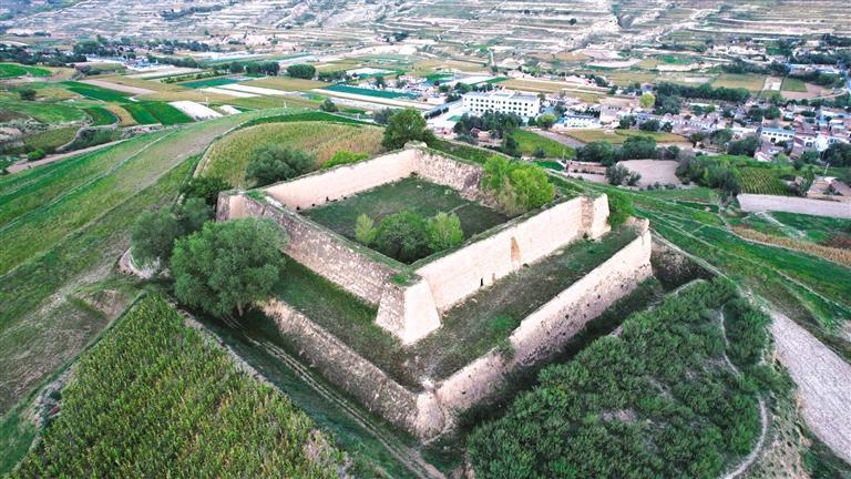 漫步騾子灘,附近的水家坡堡子也值得一去。這個(gè)堡子呈正方形,占地超4畝,不管從哪個(gè)視角看,都稱得上震撼。堡子分上下兩層,下層高5米、寬5米、邊長(zhǎng)55米,上層高6米、底部厚3.5米、頂部厚2米、邊長(zhǎng)35.5米。堡子外圍修有一圈寬5米、深6米、總長(zhǎng)230余米的壕溝,曾為護(hù)城河。堡子約建于1946-1948年間,用來(lái)辦公和防御戰(zhàn)爭(zhēng)。1949年8月,解放軍在水家坡地界圍剿國(guó)民黨馬步芳部隊(duì),經(jīng)過(guò)一天一夜戰(zhàn)斗,馬步芳部隊(duì)潰敗逃往新營(yíng)方向,當(dāng)時(shí)有一發(fā)炮彈落在堡子一角,至今炮坑清晰可見。