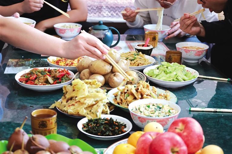 金萬(wàn)裕今年77歲,留著山羊須,筋骨強(qiáng)健,精神矍鑠。他家有21畝地,洋芋今年就種了10畝。當(dāng)天,是他家挖洋芋的第二天,孫子挖,金萬(wàn)裕撿。這里的紅洋芋,淀粉含量高,秧有半人之高。臨近中午,金萬(wàn)裕邀記者回家吃洋芋。在寬敞透亮的新房子里做客,喜悅的氣氛和一桌洋芋宴足以讓人解饞、解乏,尤其是“破皮襖”(油壺喧)就洋芋菜,簡(jiǎn)直是一絕。種植一直是金家的一份可觀收入,洋芋、大豆都是盼頭,如今房子住套院,孫子在開塔吊,三代人和諧幸福。
