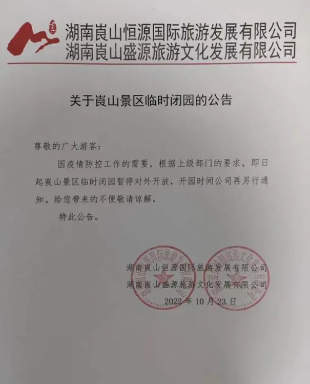 10月25日電 10月24日,崀山旅游區(qū)發(fā)布《關于崀山景區(qū)臨時閉園的公告》稱,因疫情防控工作的需要,根據上級部門的要求,10月24日起崀山景區(qū)臨時閉園,暫停對外開放,開園時間將另行通知。