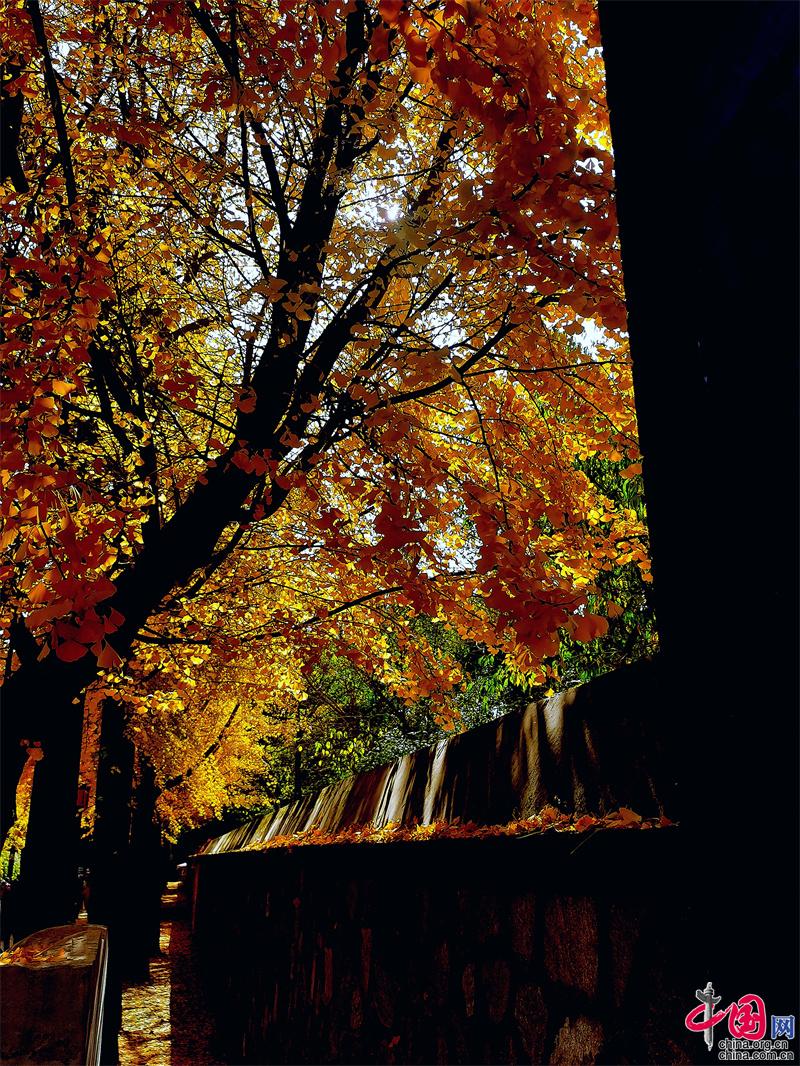 而圓明園的秋色,同樣不落秋之美。黃葉與殘垣相襯,透露出特有的滄桑與悲涼。它美得那么寂寞,那么孤獨。只有在銀杏大道上,才能聽到喧鬧之中,那熙熙攘攘的歡呼之聲。
