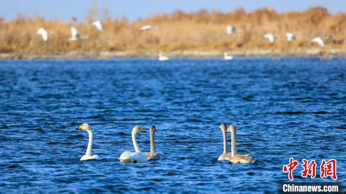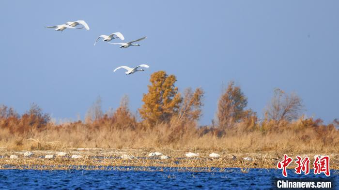 中新網烏魯木齊11月15日電(年磊)11月14日,位于新疆維吾爾自治區(qū)巴音郭楞蒙古自治州博湖縣境內的博斯騰湖白鷺洲迎來大批天鵝,它們三五成群結伴游弋,嬉戲追逐,優(yōu)雅的身姿成為博斯騰湖一道靈動的風景線。