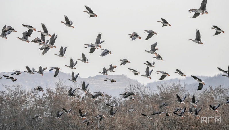 組圖丨甘肅涇川:大雁南飛途中覓食忙