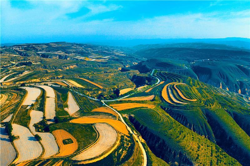 固原梯田分布于寧夏南部六盤山區(qū),始于上世紀60年代,是當?shù)厝罕妶猿謶?zhàn)天斗地“坡改梯”、既種莊稼又種風景,“一任接著一任干,一張藍圖繪到底”,精心打造的一項規(guī)模宏大的綠色生態(tài)工程。美輪美奐的梯田鑲嵌在黃土高原上的每一處褶皺上,條條田壟如鏈似帶,從山腳盤旋至山頂,層層疊疊,高低錯落,形成春賞山花、夏觀梯田、秋品紅葉、冬覽水墨的四季畫卷,被譽為最美的大地“指紋”“中國最美旱作梯田”,入選“中國美麗田園”10項梯田景觀之一。寧夏梯田看固原,固原梯田看彭陽。彭陽梯田既是黃土高原上梯田的縮影,也是黃土高原生態(tài)治理的典范。近年來,打造的金雞坪梯田公園、嘛喇灣梯田公園、青云灣梯田公園三大核心“五彩梯田”公園,每年4月“山花旅游節(jié)”游人如織,在“77號彩虹路”加持下,成為新晉網(wǎng)紅打卡地。