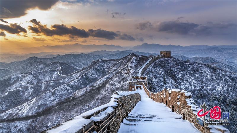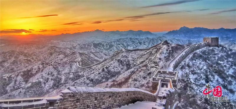 皚皚白雪覆蓋長城內(nèi)外,銀裝素裹金山嶺氣勢磅礴。