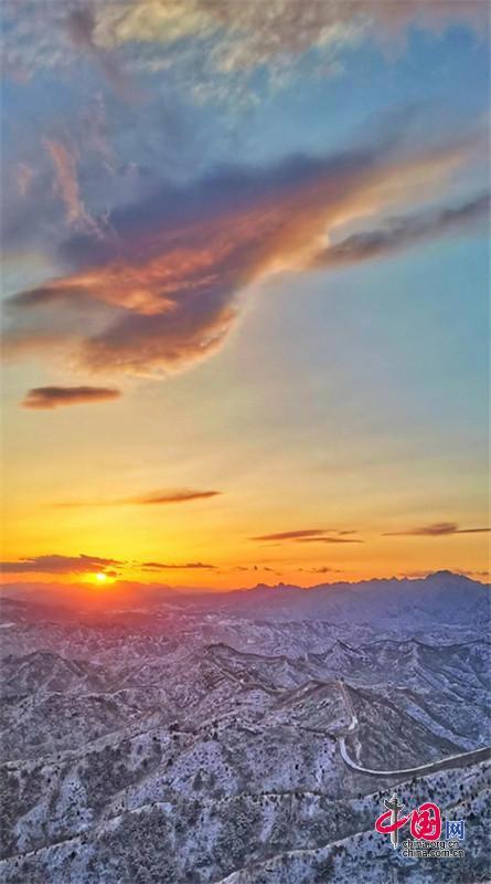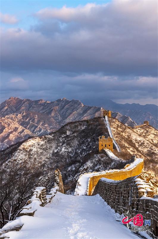 雪后,金色陽光映襯下,河北承德灤平縣的金山嶺長城巍峨壯觀,美如畫卷。