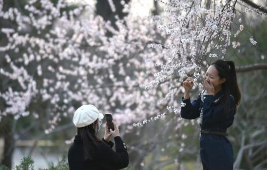 3月8日,游客在北京玉淵潭公園賞花留影