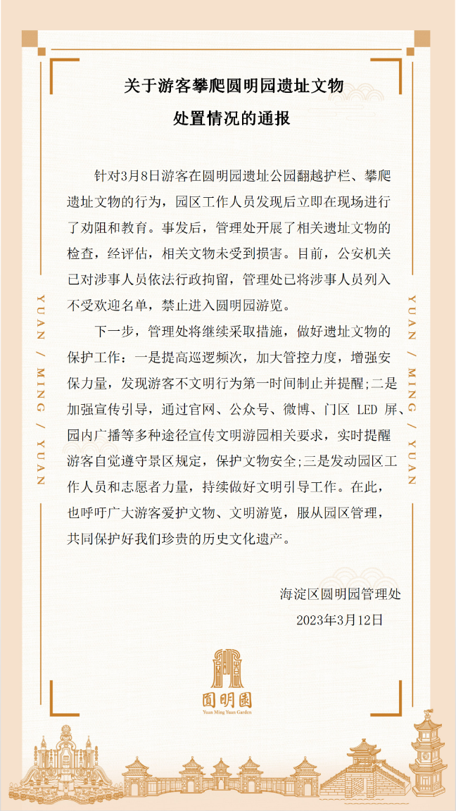 《通報》指出,針對3月8日游客在圓明園遺址公園翻越護欄、攀爬遺址文物的行為,園區(qū)工作人員發(fā)現(xiàn)后立即在現(xiàn)場進行了勸阻和教育。事發(fā)后,管理處開展了相關遺址文物的檢查,經(jīng)評估,相關文物未受到損害。目前,公安機關已對涉事人員依法行政拘留,管理處已將涉事人員列入不受歡迎名單,禁止進入圓明園游覽。