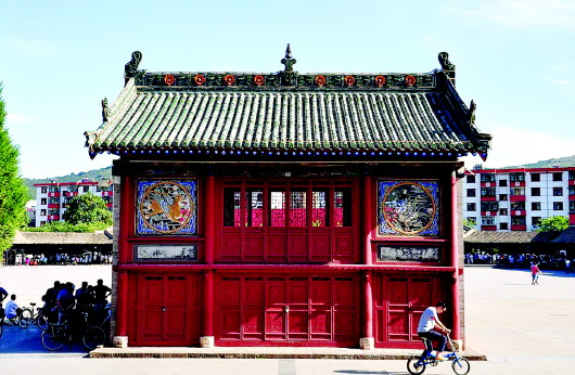 在伏羲城中,伏羲廟無(wú)疑是這座古城的中心和靈魂。廟區(qū)坐北朝南,總占地3萬(wàn)多平方米,由廟前祭祀廣場(chǎng)、戲樓和三座牌坊構(gòu)成的廟前區(qū)和伏羲廟的廟區(qū)三大部分組成。在伏羲廟明清古建筑群中,第一座古建筑便是戲樓。