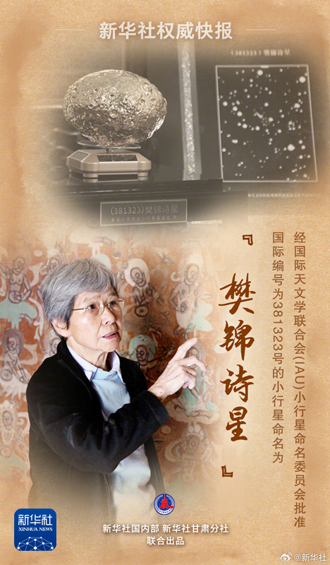 7月10日,樊錦詩從事敦煌文物工作60年座談會在敦煌舉行。會上正式命名了編號381323小行星為#樊錦詩星#。繼向北京大學(xué)捐資1000萬元支持敦煌學(xué)研究后,樊錦詩再向中國敦煌石窟保護(hù)研究基金會捐資1000萬元,用于敦煌文物事業(yè)發(fā)展和急需人才培養(yǎng)。捐款來自樊錦詩所獲獎金及個人積蓄。(記者:張玉潔 施雨岑 張智敏)