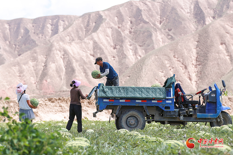7月31日,甘肅省白銀市會寧縣土高山鄉(xiāng)種植的砂田西瓜喜獲豐收,瓜農(nóng)們忙著采收、搬運、裝車外運,“搶鮮”上市銷售。