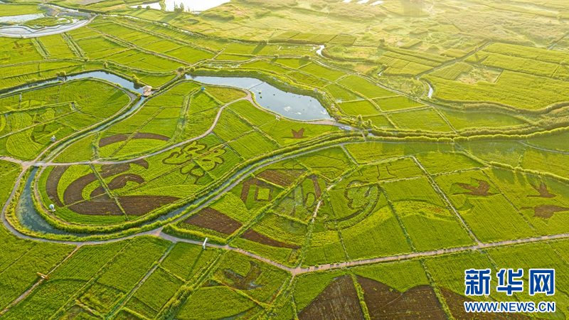 8月20日,在甘肅省張掖市甘州區(qū)烏江鎮(zhèn)新河田園綜合體藝術稻田景觀區(qū),以“絲路水鄉(xiāng)·稻畫田園”為主題組成的稻田畫惟妙惟肖、栩栩如生,呈現出祁連山下別樣的田園魅力。新華網發(fā)(成林 攝)