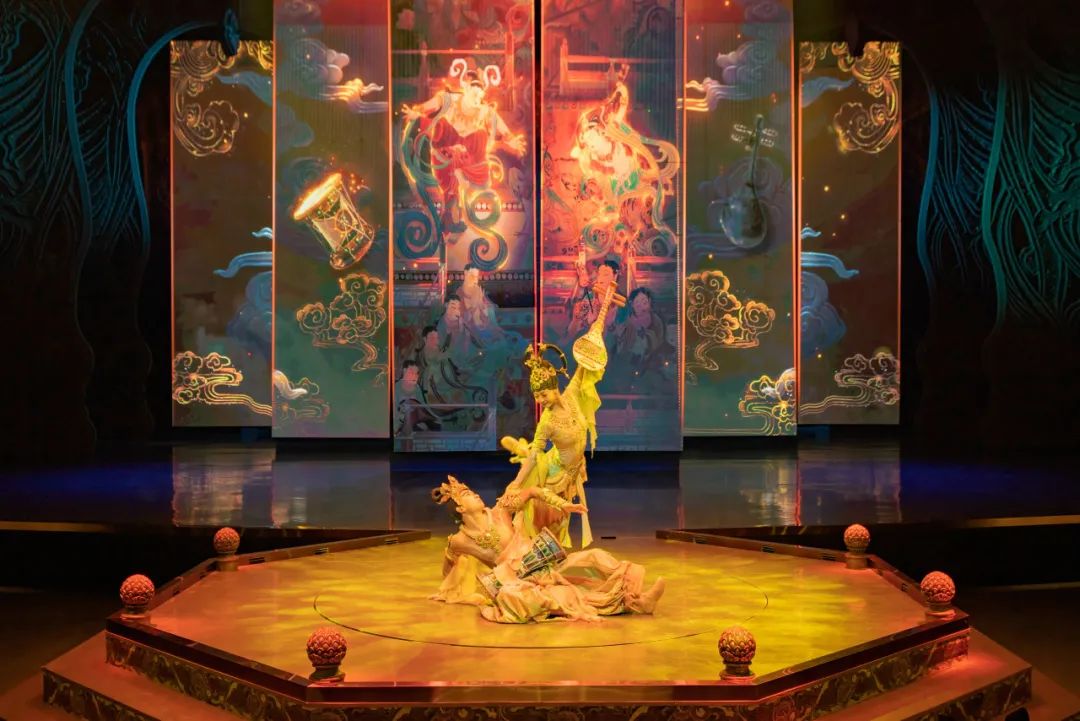劇中運(yùn)用了五弦琵琶、排簫等民族樂器及敦煌仿制樂器,演繹了胡旋舞、琵琶舞等敦煌舞蹈,配合取材自敦煌古樂譜和西域曲調(diào)的劇目樂曲,還原了敦煌壁畫中的樂舞盛景。在演出模式上,《樂動敦煌》打破了人和舞臺間的界限,讓觀眾置身劇場,近距離感受敦煌傳承千年的古樂文化魅力。