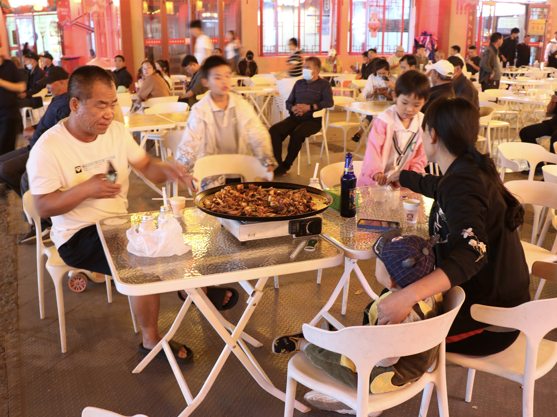 沒(méi)有過(guò)多的餐具,鐵鏊為盤(pán),再添置幾副筷子,配上一杯甘甜的米酒或棗茶,一桌人圍坐在小桌前盡享美味,熱鬧非凡。